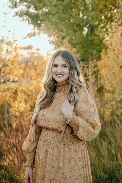 Close-up photo of Alexy Nelson, a registered dietician, in a yellow dress with fall colors.